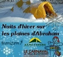 Le Carnaval de Québec, en collaboration avec Horizon 5 Plein Air, vous offre une occasion unique de vivre un camping d’hiver sur les plaines d’Abraham. Seulement 3 nuits possibles, les samedis 29 janvier, 5 et 12 février 2011. Faites vite les places sont très limitées.